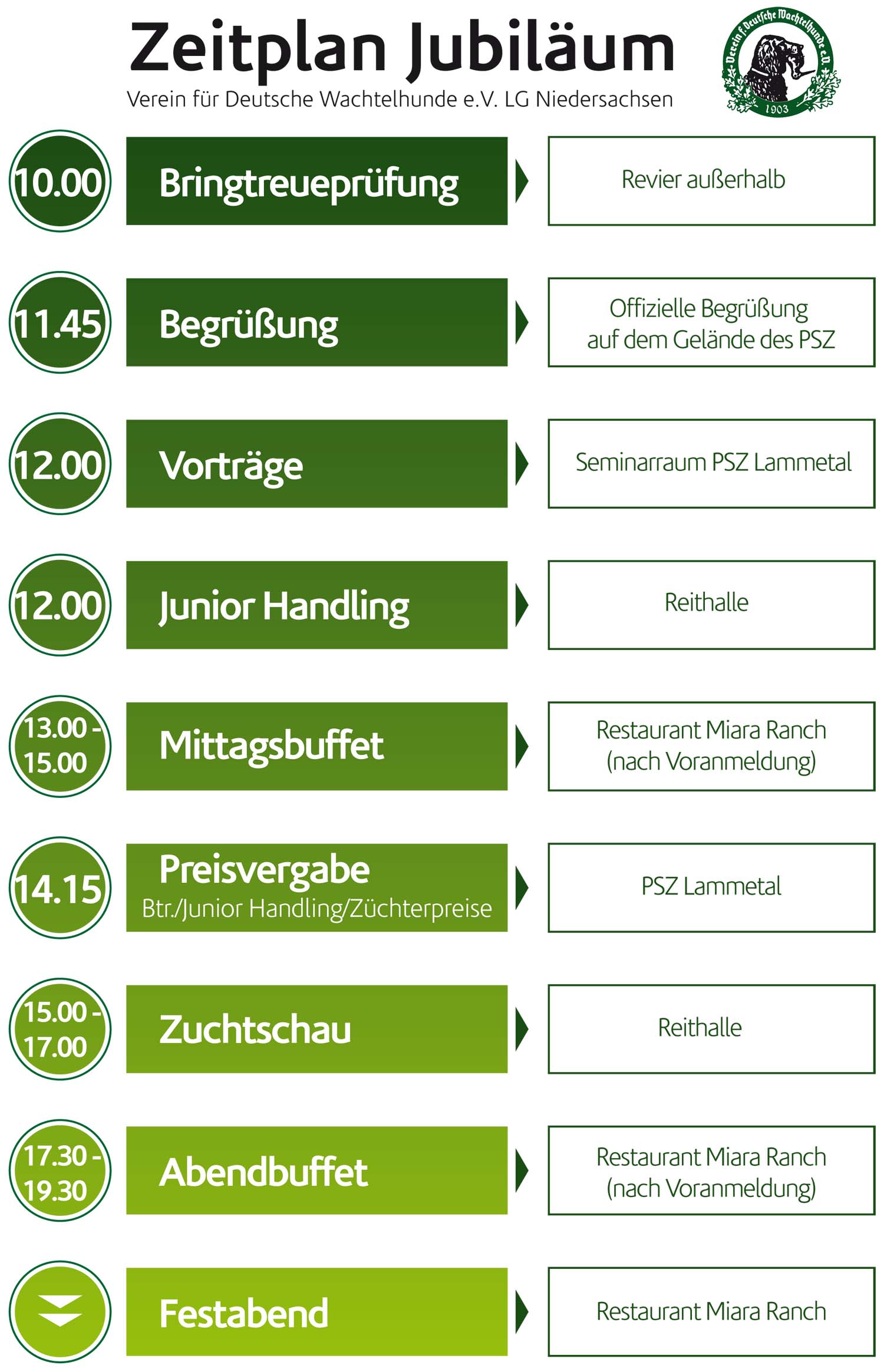 Umrahmt wird die Jubiläumsfeier mit Seminaren, einem „Junior Handling“, einer Zuchtschau der norddeutschen Wachtelhundzwinger, einer Bringtreueprüfung und einem bunten Rahmenprogramm. U.a. können auch Schutzwesten für Hunde angemessen