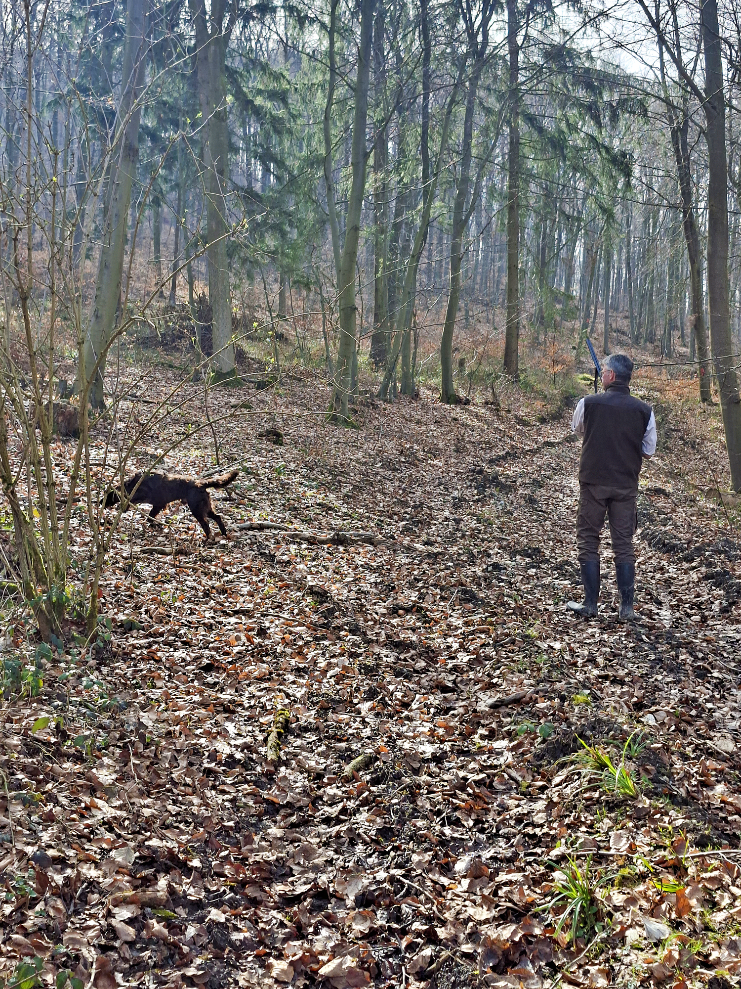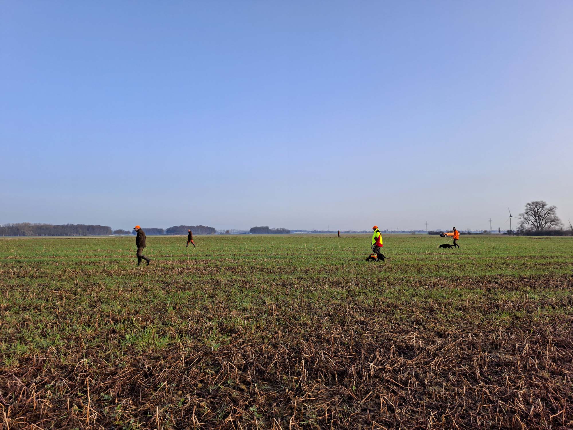 Erfreulicherweise begrüßte uns Jobst Lüttgeharm nun schon zum wiederholten Male sehr herzlich zur Jugendprüfung auf seinem Hof in Pattensen. Neben den sechs gemeldeten Gespannen, fanden sich frühmorgens auch weitere Interessierte bei herrlichem Sonnenschein rechtzeitig ein, so dass es umgehend bei guter Bodenfeuchte in die Hasenreviere gehen konnte. Das Verhalten am Wasser prüften wir unterhalb der Marienburg bei Familie Heuer und das Stöbern, sowie die Schussfestigkeit in ausgedehnten Laubholzbeständen der Klosterrevierförsterei Wülfinghausen. Vielen Dank an Jobst, Tobias, Arndt, Malte sowie an Stefanie Schotte für die Prüfungsmöglichkeiten. Die Sonne schien den ganzen Tag und erwärmte die gering bewegte Luft von morgens 0 Grad auf 17 Grad am Nachmittag.