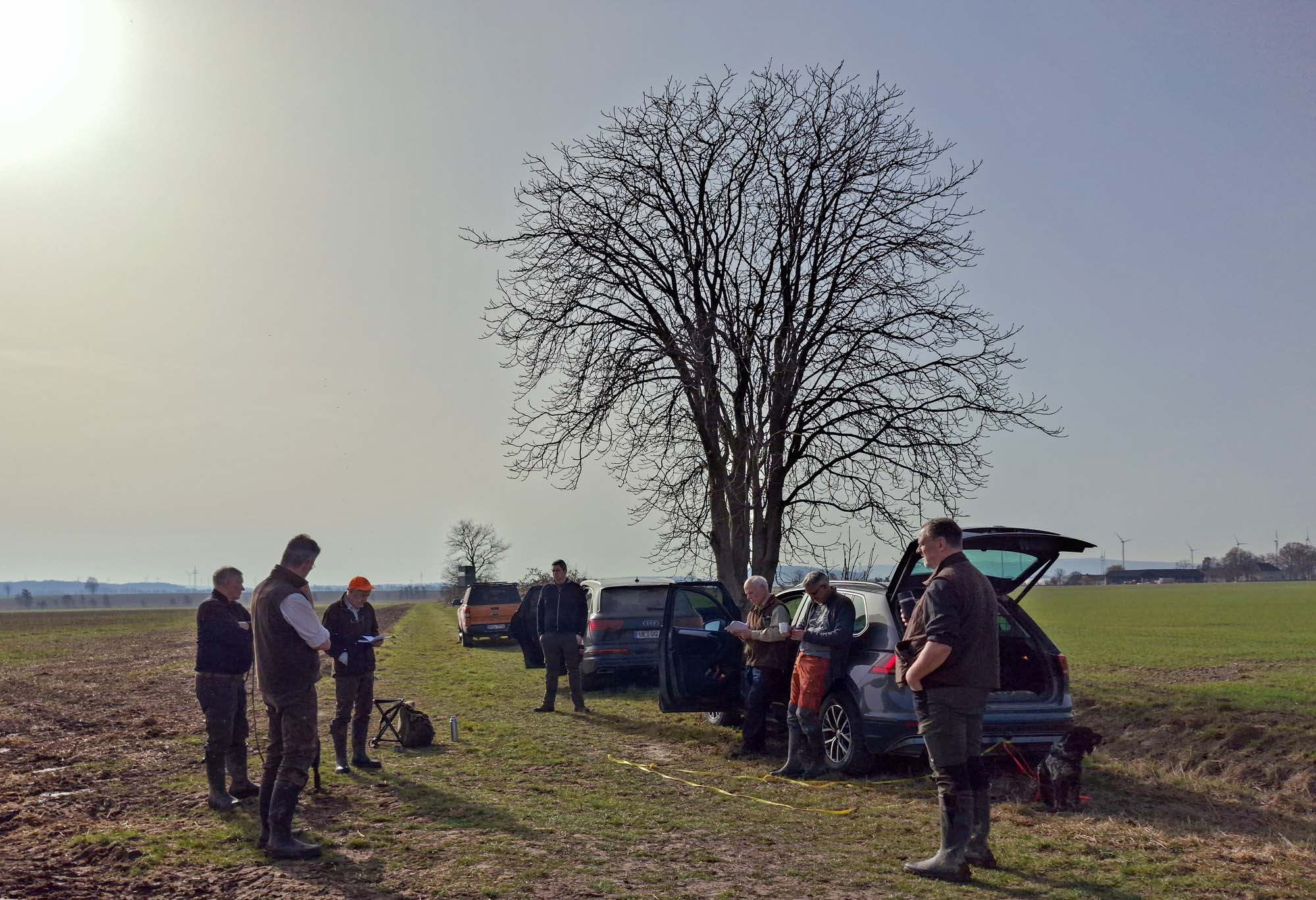 Bei leichtem Regen trafen wir uns morgens für die JP im Bereich Dassel auf dem Hof des NLWKN in Salzderhelden. Am Morgen nur 2 Grad, stiegen die Temperaturen im Tagesverlauf auf 8 Grad bei leichtem Wind aus nordwestlicher Richtung an. Die Saaten auf den Ackerflächen waren bereits in der Vegetation leicht vorangeschritten, sodass man prinzipiell von sehr guten Bedingungen für die Arbeit auf der Hasenspur sprechen konnte. Diese wurden auf den mehrfach bewährten Feldflächen der Reviere Immensen und Hullersen geprüft. Sehr gute Hasenbesätze ermöglichten uns erneut eine komfortable Durchführung der Prüfung mit gut bewertbaren Arbeiten. Den Revierpächtern, insbesondere Thorsten Ebrecht und Helmut Hesse, den Ortskundigen, die uns unterstützt und bei Bedarf Straßen abgesichert haben, sei hierfür herzlichst gedankt. Alle übrigen Fächer konnten in Revieren des Forstamtes Dassel abgeprüft werden. Auch hierfür gilt unser Dank der guten Zusammenarbeit. Vorkommende Schalenwildarten waren Rot-, Muffel-, Schwarz- und Rehwild. Am Ende des Tages erreichten alle Gespanne mit guten Leistungen das Tagesziel. Zufrieden der Leistungen ließ man den Tag in gemütlicher Runde im Gasthaus „Zum Sollinger Wald“ ausklingen.