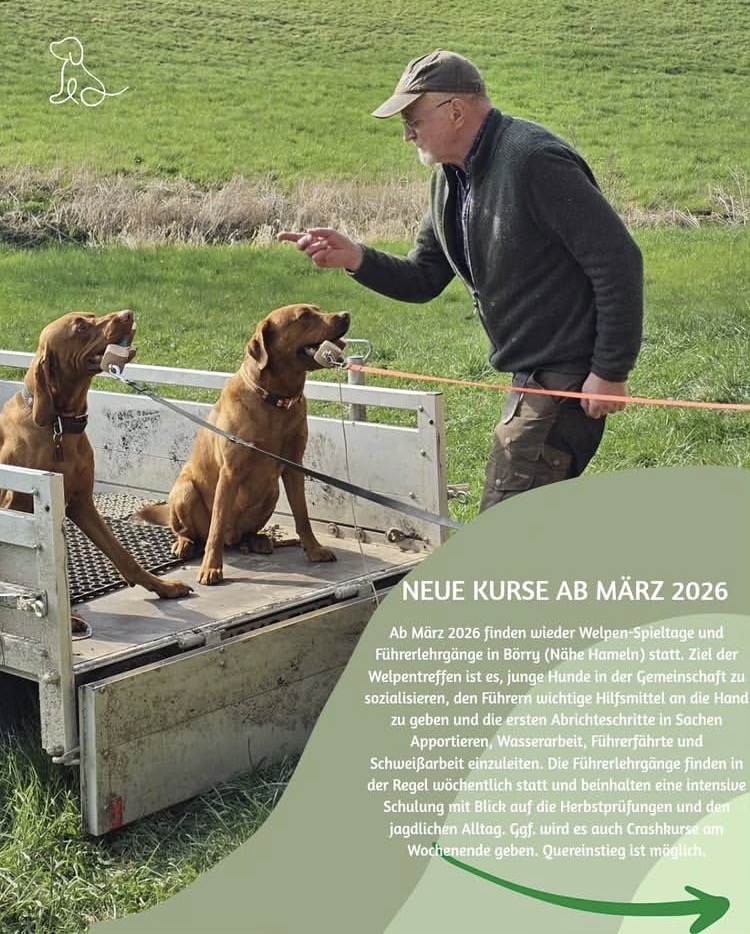 Welpen-Spieltage/Führerlehrgänge Ab März 2026 (beginnend am 28.03.2026) finden wieder Welpen-Spieltage und Führerlehrgänge in Börry (Nähe Hameln) statt. Ziel der Welpentreffen ist es, junge Hunde in der Gemeinschaft zu sozialisieren, den Führern wichtige Hilfsmittel an die Hand zu geben und die ersten Abrichteschritte in Sachen Apportieren, Wasserarbeit, Führerfährte und Schweißarbeit einzuleiten. Die Führerlehrgänge finden in der […]